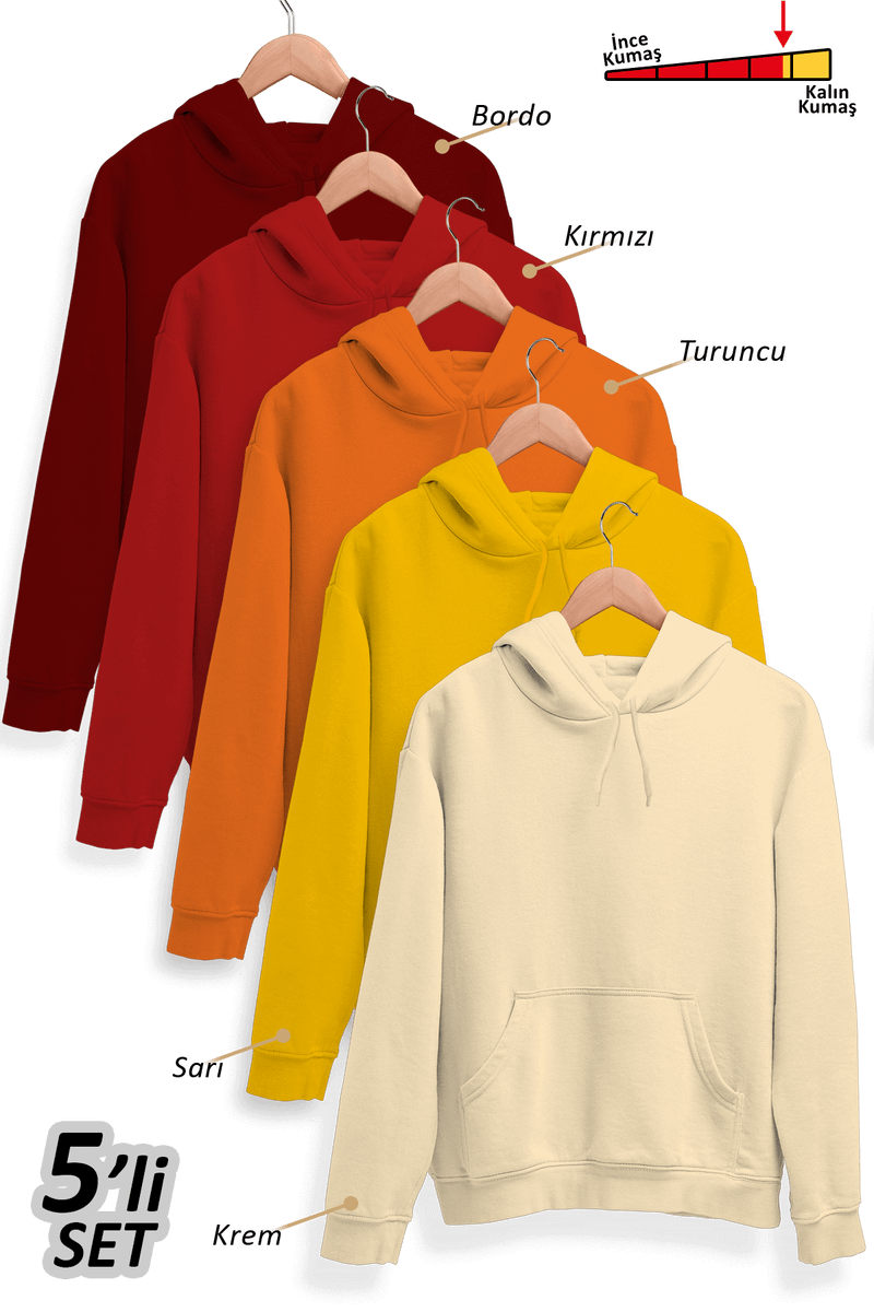 Tarzı ve rahatlığı bir araya getiren 5’li Kışlık Unisex Kapşonlu Sweatshirt Seti, her ortama uyum sağlayan sıcak tonlarıyla kış kombinlerinin vazgeçilmezi olacak.