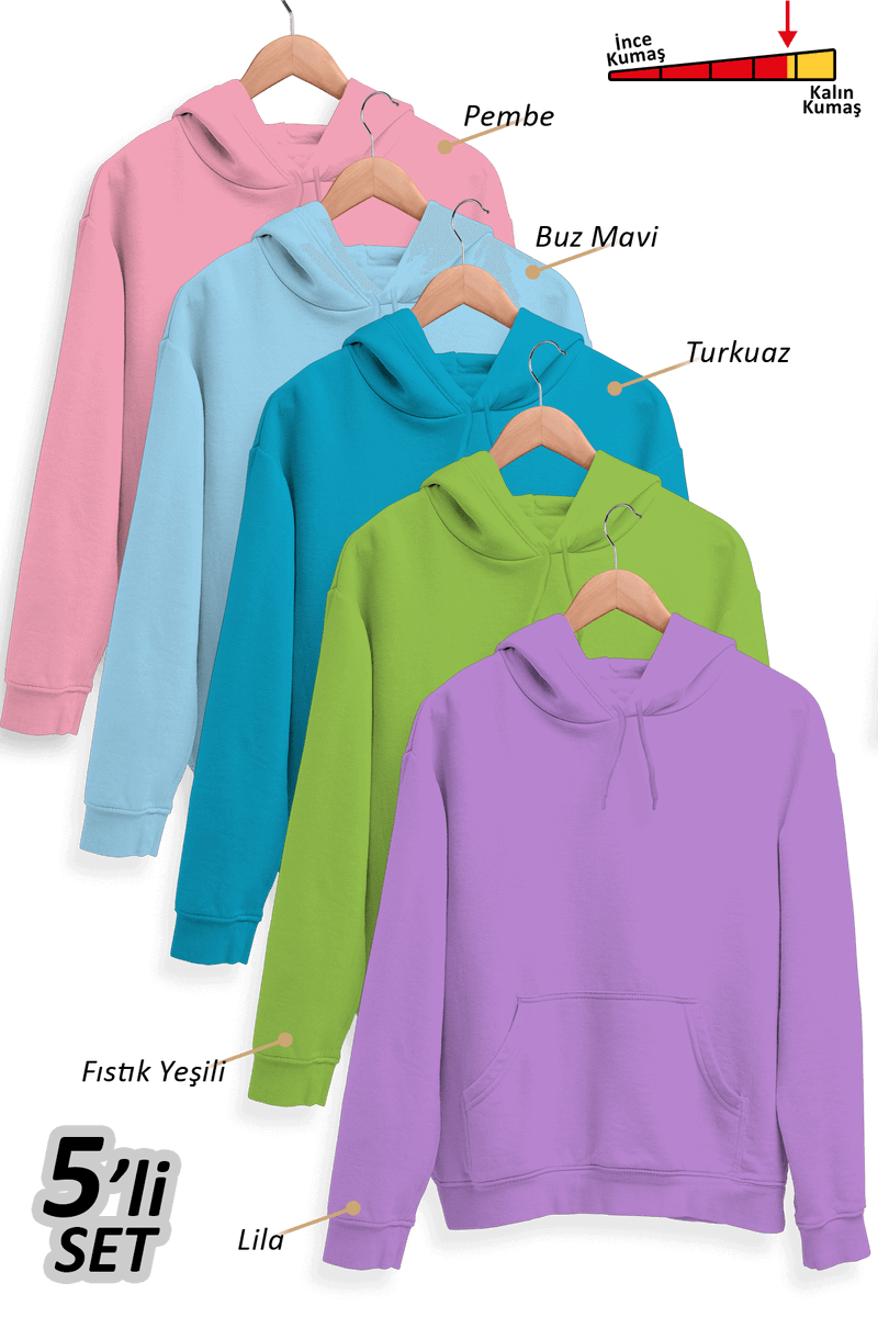 Renkli tarzıyla dikkat çeken 5’li Kışlık Unisex Kapşonlu Sweatshirt Seti, hem konforu hem de şıklığı bir arada sunar.