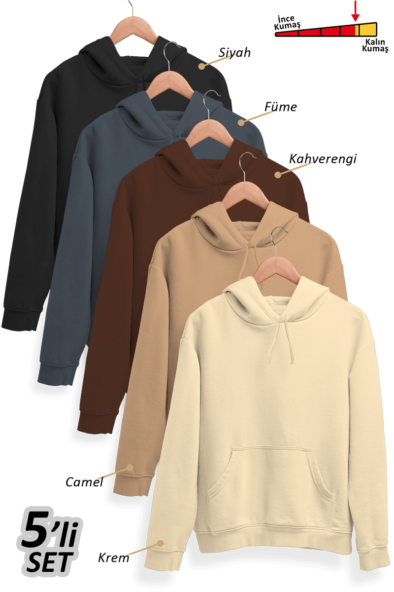 Kış aylarında hem şıklığı hem de rahatlığı ön planda tutanlar için tasarlanmış 5’li Unisex Kapşonlu Sweatshirt Seti, gardırobunuzun vazgeçilmezi olacak. Set içerisinde Siyah, Füme, Kahverengi, Camel ve Krem renk seçenekleri bulunuyor, böylece her kombinle uyum sağlıyor. Yumuşak dokusu ve kaliteli kumaşıyla gün boyu konfor sunarken, unisex tasarımı sayesinde hem kadın hem erkek kullanıcılar için uygun. Günlük kullanımda, spor aktivitelerde veya evde rahat bir stil için ideal bir seçenek. Şimdi stilinizi ve konforunuzu bir arada yaşayın!