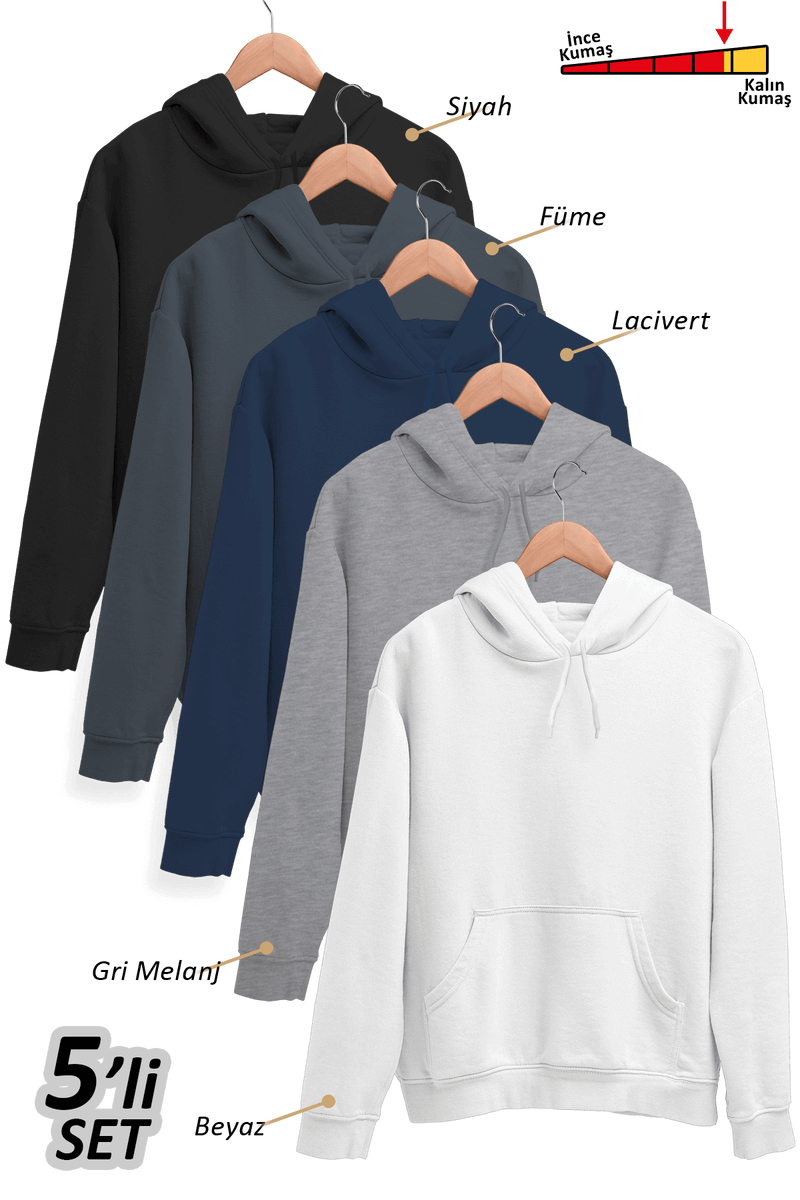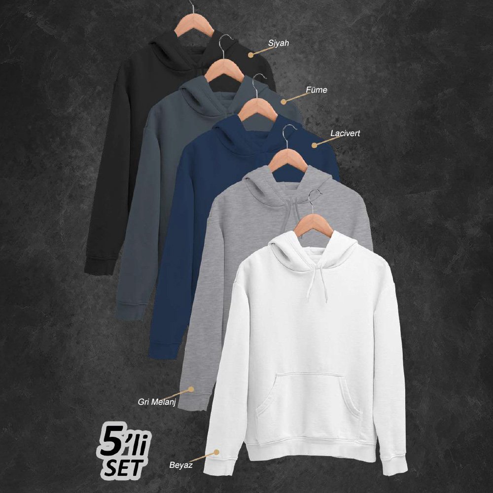Minimalist tarzın en sıcak haliyle tanış! 5’li Kışlık Unisex Kapşonlu Sweatshirt Seti (Siyah, Füme, Lacivert, Gri, Beyaz), her ortamda sade ama etkileyici bir görünüm sunar.