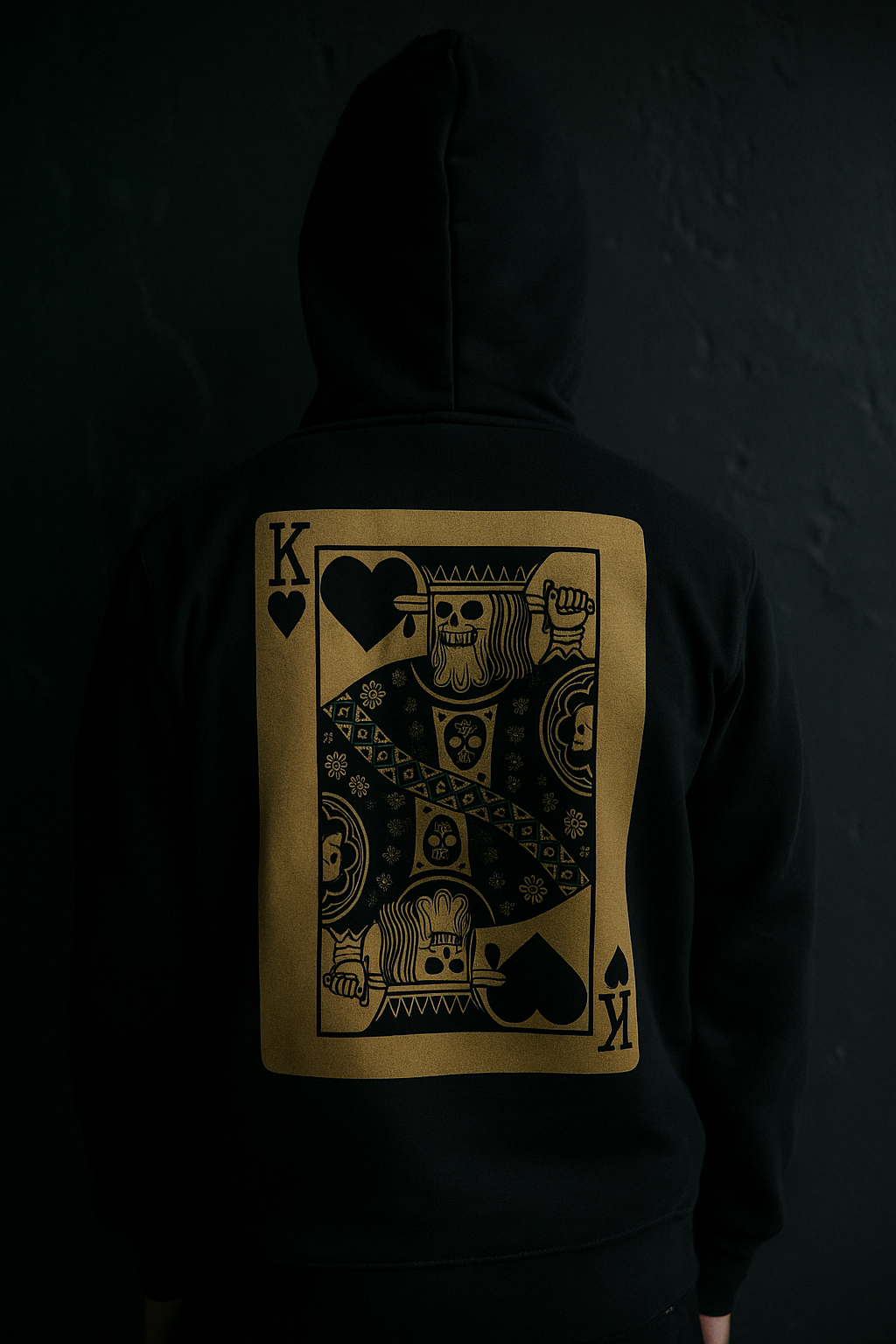 King of Hearts Siyah Oversize Sweatshirt, kaliteli pamuk karışımlı kumaşıyla gün boyu konfor sunarken sırtındaki altın tonlu iskambil kartı deseni ile fark yaratır. Sokak modasına ilham veren bu model, hem günlük kombinlerde hem de özel stillerde öne çıkmak isteyenler için mükemmel bir seçimdir.